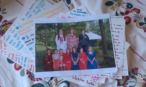 These campers (counselors in the back row) read Shadow and Bone aloud every night in their cabin, then dressed up as Grisha for the Fourth of July parade. (They also wrote me lovely notes with lots of interesting questions.)