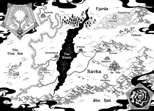 Posted the cover from the Taiwanese edition of Shadow and Bone earlier today. Here’s their map! Very different from Keith’s, but I love it, especially the symbols for Alina and the Darkling.
