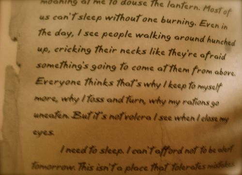 Even in the day, I see people walking around hunched up, cricking their necks like they’re afraid something’s going to come at them from above. Everyone thinks that’s why I keep to myself more, why I toss and turn, why my rations go uneaten. But it’s not volcra I see when I close my eyes.