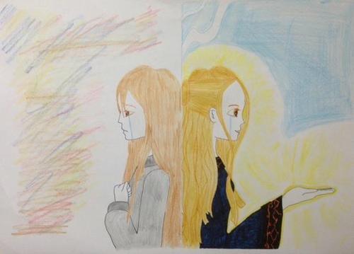 “the drawing is called Hidden Sun and is basically about Soldier Alina leaning against the mirror, silently crying because she is denying who she really is and is betraying herself. the mirror image of her is Grisha Alina who is tearfully smiling as she summons her light. the idea is that the mirror reflection is who Alina truly is.”