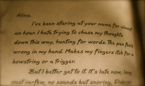 The opening of Mal’s lost letter to Alina (from the bonus content for the paperback of Shadow and Bone).
