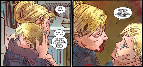 I’ll admit I’m a DC gal and as such don’t know much about the expanded details of Captain America as, say, Batman. But this is one thing that I’ve seen occasional evidence of that I really like: his mother was the person in his life that most engendered the later, central beliefs that make him the hero he is. Contrast with Martha Wayne. We know Batman is who he is because of the loss of his parents, so stories that remind the reader specifically what he lost by showing is relationship with them while alive are to be expected. But stories that actually focus on any memorable moments or even specific stories about his mother in this are in the minority. I can think of three off the top of my head, two of them by the same writer. On the other hand, references to his father, his father’s house, his father’s business (despite the fact that Thomas was a doctor who spent long hours in surgery, while Martha was the philanthropist putting their money to good use) are numerous. In Batman Begins Martha doesn’t even have any lines. In the last big event before the New 52, we saw a parallel universe where instead of the elder Waynes dying in an alley, their son did. The tragedy motivates Thomas to become that universe’s Batman. Martha becomes Batwoman, you say?