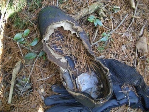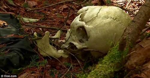 A blue jacket is all the remains of this suicide victim. Animals and morbid collectors will take bones from the dead.