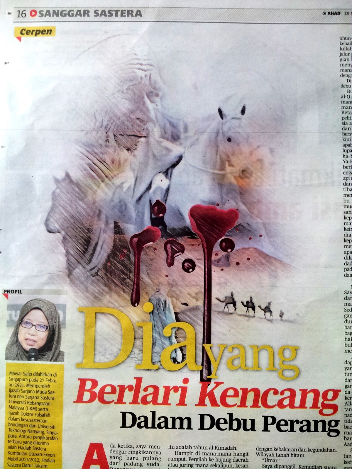 Cerpen terbaru saya di Berita Harian, hari ini 20 September 2015. Dia yang Berlari Kencang dalam Debu Perang. Terima kasih kepada Editornya, Sdr Nazmi kerana menyiarkan. Terima kasih kepada Sdr Alif Matiin kerana mengilhamkan, kisah kuda perang ini. Tulisan awalnya, saya percikkan dalam entri 9 September lalu.