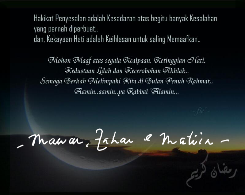 Ramadhan Kareem buat saudara sekeluargaMalam nanti kebanyakan kita akan ke surau untuk tarawikh. Moga-moga kita berikhlas hati. Moga hati kita bersih. Setiap langkah, segala gerak dan hasrat hanya untuk Allah. Rasanya kita tidak mahu terlalu berkira-kira apa yang akan kita himpunkan sejumlah angka sebagai jawapan. Ya Allah, hanya mohon kita, Allah terima. Mudah-mudahan segala itu tidak sia-sia. Susahnya untuk saya mengingat itu berkali-kali.
