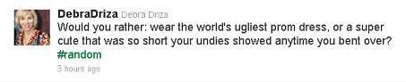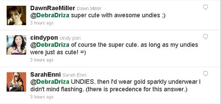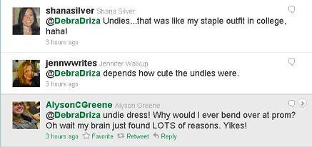 (In case you're wondering: tweeps voted almost unanimously for the cute-yet-short prom dress. Awesome undies, for the win!)