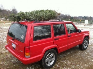 We ventured out yesterday to our tree farm. I have the ultimate Christmas-tree-getting vehicle—a Jeep Cherokee, fire-engine red. On days like this it seems like a bright, festive sleigh. We bundled up, plugged in some Christmas music and we were on our way. Hazard made the trip with us for the second year in a row. He was on his best behavior, except that in his excitement he threw up on the floor. On the farm are a couple large, athletic hounds. He wanted out be we feared for their safety.