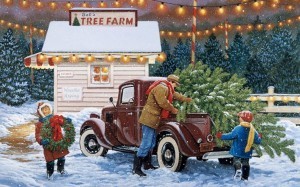 At the farm all ten of us spilled out and hiked back a lane and over a little hill to where the trees grew. Most of them were huge but there were still dozens small enough to fit into our living room. We searched up and down long rows of trees and among stumps of last year's choices. Eventually we complied a short list of finalists. We all offer our opinion but the final decision is always left to mom.