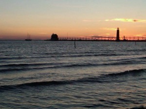 We spent a vacation day at Lake Michigan on Tuesday. It was beautiful. Kyle and Elizabeth met us there with the grandbuddies. We dinner together outdoors and stayed until the sun set and the harbor lights come on. Then we took the long, slow, beautiful walk back along the boardwalk in Grand Haven. It's one of my favorite places on earth.
