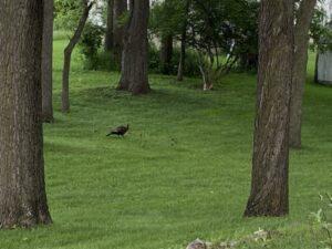 [Thursday Evening, June 9, 2022] This morning leaving for church I saw a Mom Turkey and a half dozen poults. They were wandering across the farm. This evening I was out on the porch and they made their way back in the evening cool. I got a picture. It is pretty far away because I could not imagine the difficulty of trying to raise six young at a time. I love this place. The light fled and day came to an end on Bittersweet. Tomorrow is my study day. I look forward to it all week.