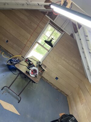An electrician friend (you want an electrician friend) has been dropping over after work to beef up the electric service to the loft of the carriage house where I am writing right now. Now I can run lights, heat, air-conditioning and the electronic tools I like to use for my writing and I can stay cool in the hot months and warm in the cold months year-round. Kyle built the wall to enclose my writing space (with some encouragement from my son-in-law Dale). I installed the insulation and the faux ship lap on the knee walls and end walls. I need a little work on the metal roof and when that is finished I will insulate and finish the ceiling. My goal is to have that done by the end of November when the cold will start to get noticeable.