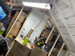 A friend came over to run electrical outlets, Kyle built me a wall and installed a nice door to divide the large loft in half. I fixed the window and installed a lock set in the door. I’m planning to add insulation, faux ship lap on the walls and ceiling, a nice area rug on the floor, a reading chair and floor lamp, and my carriage house writing loft will be useful year-round. The roof slopes to knee walls. I am tempted to add book shelves to the walls. We’ll see.