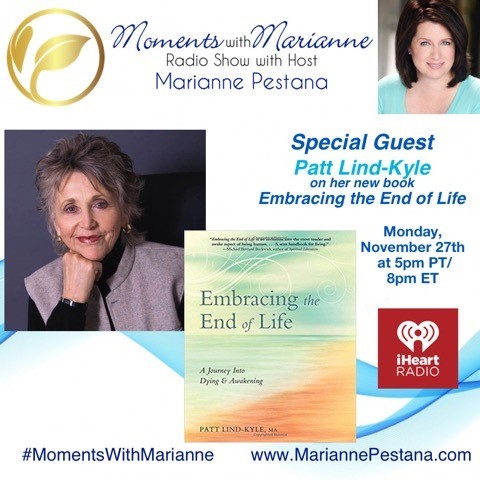 Mark your calendar and tune in Monday, November 27th at 8pm EST/5pm PST for an interview on Moments with Marianne with special guest Patt Lind-Kyle as we discuss my new book Embracing the End of Life.