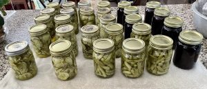 My wife Cathy has spent this weekend canning and freezing: blackberry jam, bread and butter pickles, and corn. I’ve lent a hand: toting, shucking, mashing, cleaning. My mother spent her summers preserving food, so it’s a nostalgic thing for me to listen to the jar lids popping as they seal, the hot jars cooling, the air pressure in the jars changing, creating something of a vacuum that sucks the lids down. Hence, the pop.