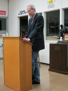 This is the community college where I spent two years before transferring to Eastern Illinois University. More old friends, more relatives. I did a question and answer with OCC students before doing a reading for the public. My excellent host, Charlotte Bruce, had everything running in smooth order. The public information and marketing coordinator, Deanna Ratts, had done a wonderful job with publicity. The reading was at noon, with lunch served, and after my reading I got to sit down with some food and visit with family members. My tasty bread was made by Charlotte's husband, Terry, a former member of the United States House of Representatives. It's not often that I can say that a former congressman cooked for me.