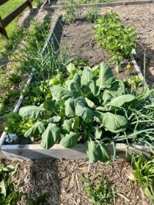 Our plot at the community garden is beginning to produce. I’m enjoying lettuce, spinach, and radishes. Blooms are about to come on our bush beans. Onions are growing. I see the beginnings of blossoms on our tomato and pepper plants. I love this 4 x 12 foot raised bed. I love working up the soil in the spring and sewing the first seeds. It thrills me to see the first hint of green—always the radishes, of course—poking through the earth. I love the watering and the tending as I wait to pick the first green beans, the first bell pepper, the first tomato. I love the fall planting and the last of the harvest. Even though there’s a hint of sadness, I even love putting the garden down for the winter.