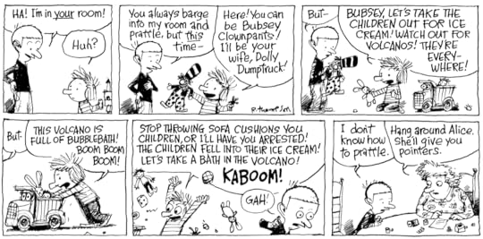 In the last chapter of the forthcoming must-have book of the year, the Art of Some Guy, I bloviate, dilate & expound on comic strips at excruciating length with Bill Watterson, with a few unrelated ventures into global politics, sports and fashion. At one point, there's this exchange;