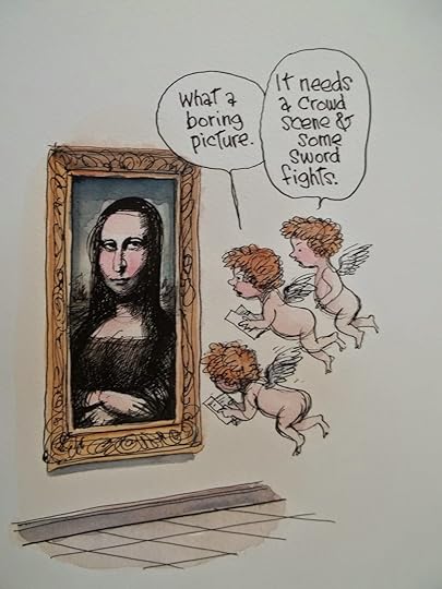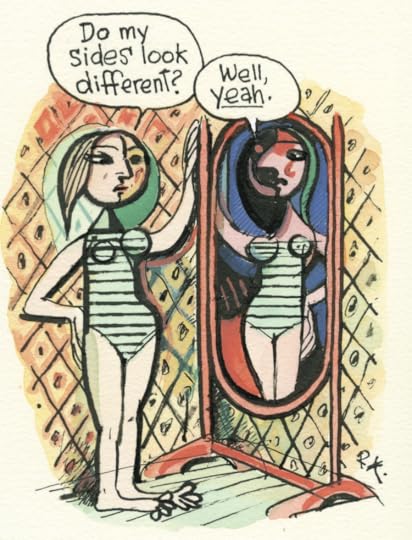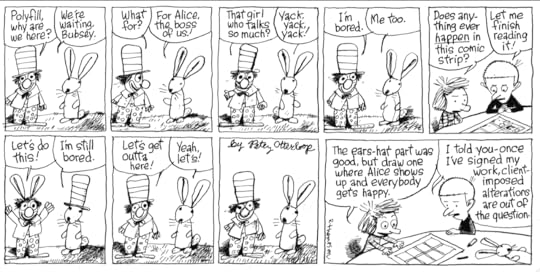 RT: I remember one of the first interviews I gave to some reporter somewhere. She called and I told her "the particular is always more funny than the general." And she said, "could you be more specific?" (BW and RT laugh). And I couldn't! I hemmed and hawed for ten minutes! (Laughter).My point is not that I can hem & haw for ten minutes (my current personal best for hemming & hawing is 24 hours). My point is the Specific is funnier than the General. It's axiomatic, whatever that means, and I still can't think of any specific examples. So let's run some strips to distract you and make you think you've learned something.