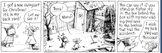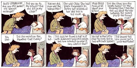 This is what I was trying to get at in the previous post about the specific vs. the general. A comic strip is the ideal medium to bear small ideas (no jokes, please), especially one with little kids in it. I'll show you; here's a strip from the Post Magazine that's not in the Complete Cul de Sac because I forgot about it, even though it's one of my favorites; I gave it to my brother for Christmas. He kindly lent it back for use in the Art book.