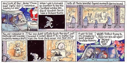 That's taken from a true, well I hate to call it a "story"; it's barely an anecdote. But both of us remembered it, that one inch gap between iron and shirt that made the animatronic maid's efforts so stupidly poignant. Woodie's windows were an important part of Christmastime for us as it was for many in the DC area, so I knew this would resonate back when CdS was a local strip.