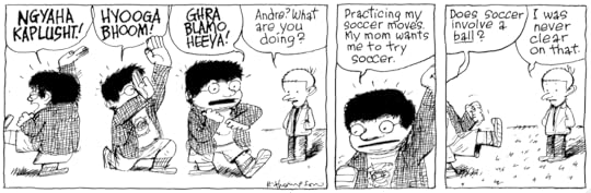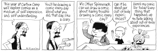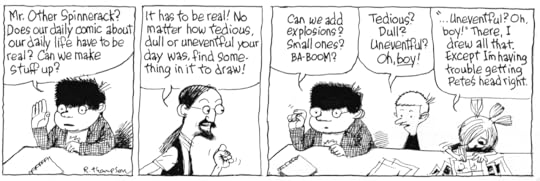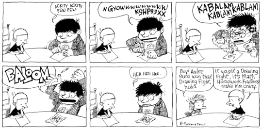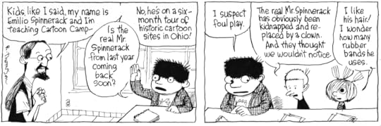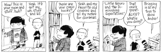 No, where I think I got it right is in Petey's cohorts from Cartoon Camp; Loris Slothrop & especially Andre Chang (the connection to Andre the Giant didn't occur to me). Loris is kinda one-joke: she's fast and full of energy. But Andre has depth. They were designed out of necessity; Petey needed a milieu, he was surrounded by nothing but little kids and he needed somebody his own size to pick on him. I had to think-what would a friend of Petey's look like or be like? The same but the opposite. Large where Petey is small and loud where Petey'd be quiet.
