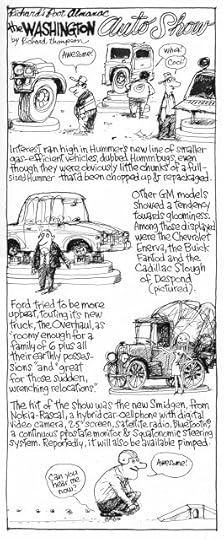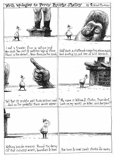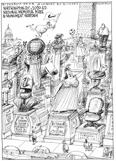 This was done during that dark period in our country's history when Gene Weingarten edited Richard's Poor Almanac. Which is to say, before this was even called Richard's Poor Almanac, and Bill Clinton daily inflicted his psychodrama on the American people. And boy, didn't I get this one wrong, if by "this one" we mean "Clinton's legacy."But it was fun to draw, although from the amount of white-out in evidence, it was also a pain in the ass to draw. So it's no wonder this cartoon has never seen the light of day since its first publcation.