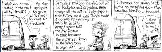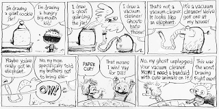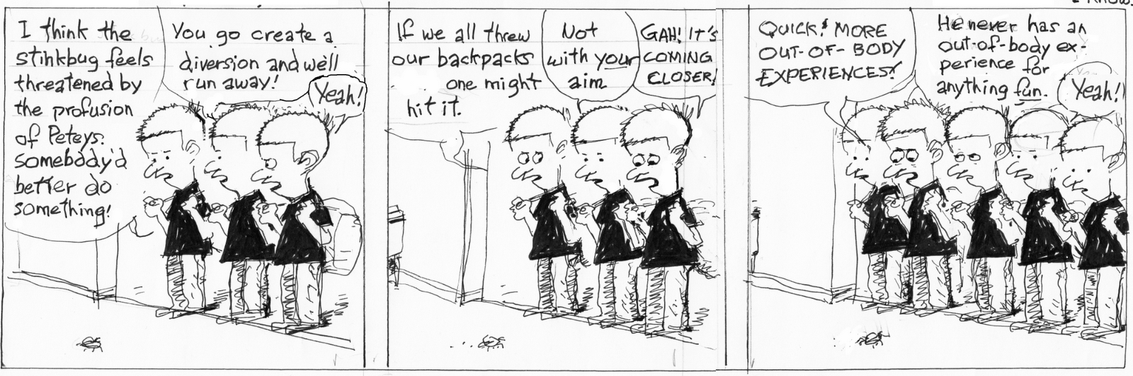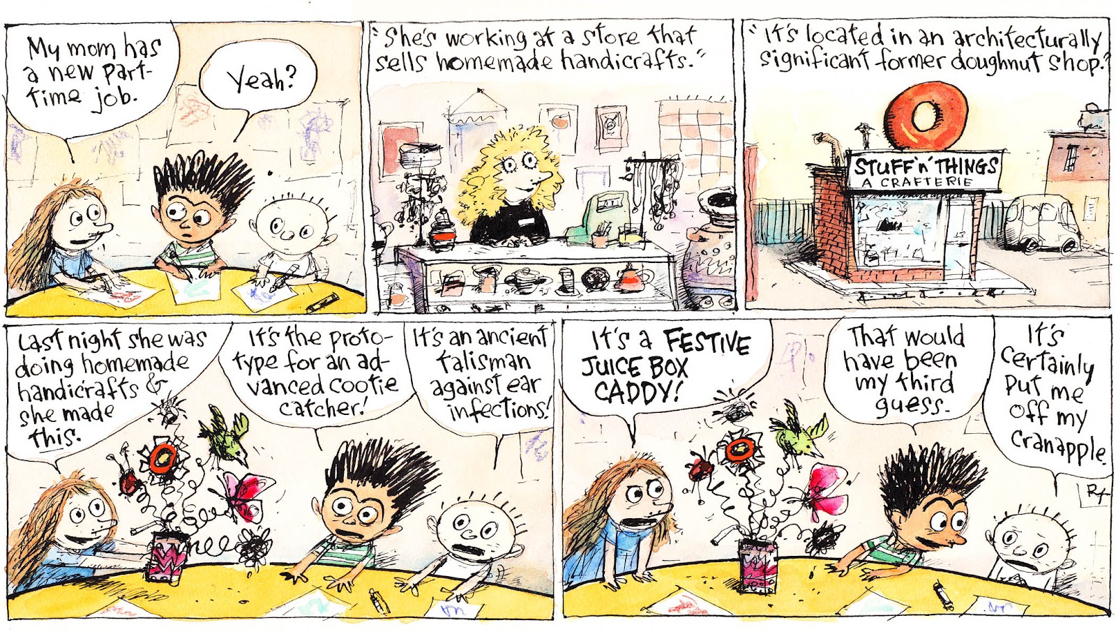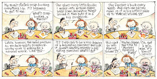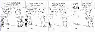 Here are the roughs I sent to Stacy Curtis for this week of strips. Besides inking Cul de Sac, Stacy's got a full plate of children's book work, some of which involves traveling for school visits. This means he has to do the inking in a hotel room, not the most ideal situation for us sensitive art types whose psyches demand a familiar work environment to maintain creative flow.