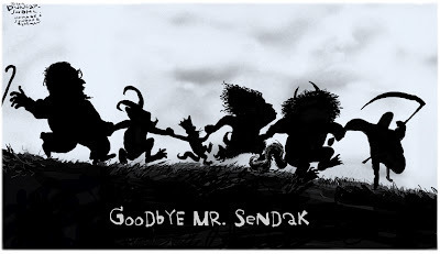 Peter Dunlap-Shohl drew this wonderful piece on the death of Maurice Sendak last week, ingeniously mashing up the Seventh Seal and the Wild Things. I especially like the casually tossed-away cane at far left. I was going to link to a documentary done by director Spike Jonez where he visits Sendak at his home but it's been taken off the web. I will link to a great obit by Philip Nel at the Comics Journal. Phil's been working on a massive biography of Ruth Kraus and Crockett Johnson and he knows his children's literature.