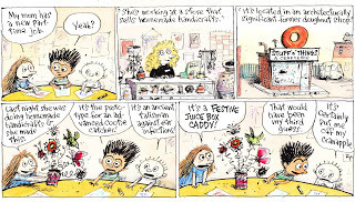 I hope. These are representative of the batch of roughs I foist on Stacy every week. Note how they get gradually sloppier as I lose track of the progress of the meager story arc. In fact I had no idea how to end it, so I told Stacy I would do the climactic Saturday strip, which features enough second panel exposition by Alice to frighten off anyone who dislikes text-heavy balloons.