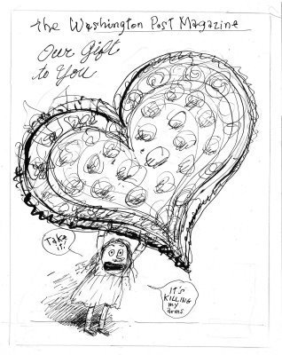 Cul de Sac is now eight years old, having launched in the Washington Post Magazine in its 2004 Valentine's Day issue. Above is the first sketch and the drawing used on the Post Mag cover the week it debuted. Originally it was going to be on the plastic bag holding the paper too, but that didn't happen. Which is a relief, as it might've scared away Post readers and depressed sales.
