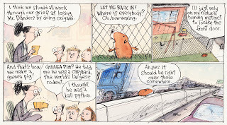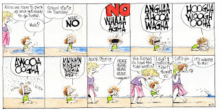 This is the last Sunday I drew before my hiatus. It's one of those strips that tickles me no end, which is kinda rare.What I most enjoy is a strip that spins in a circle then takes off in an unexpected direction and this one does that if nothing else. I hit a wall in writing it until the phrase "spray cheese" popped into my head then all the pieces fell into place (note to playwrights, novelists & New Yorker short story writers; when in a bind think "spray cheese"). Otherwise the only thing I struggled with was the expression on Alice's face. That took a stack of paper and half a bottle of ProWhite to achieve; you'll note the relative stiffness in Alice's face in the first panel after I'd tweaked it into lifelessness. By the third panel I had it down.
