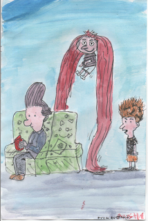 This blog has a long and noble tradition of posting art by fans of Cul de Sac, most of whom draw a whole lot better than the regular guy. One such is Austin Milne, who sent in this deft portrayal of Alice, Petey and Dad. He says he's drawn them all, "from Alice's imagination," which I like because it shows he's figured out the whole point if the strip. And when he's got a moment, I hope he'll explain it to me.