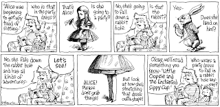 My original plan was to have a week of Mom reading Lewis Carroll to Alice, with Alice responding in various annoying ways. Like here, where she's fixating on some pointless digression because that's what four-year-olds often do.I don't remember why but the week got boiled down to a Sunday. It's an excuse to try drawing like the formidable John Tenniel, whose definitive Alice illustrations show Wonderland in careful, other-worldly detail and solidity. Which was a stupid thing to do, as I discovered after fussing with the counterfeit Tenniels and using up half a bottle of ProWhite on Alice alone. I meant to save the roughs for this and post them. They were nice and loose and got a semi-Tennielly effect in a few quick lines without any worrying but I must have chucked them.