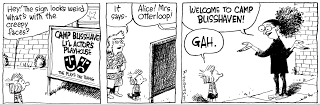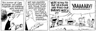 Originally I was going to have Camp Blisshaven be a craft camp where kids would make knicknacks and. tchotchkes and other hard-to-spell-things. But I changed it at the 10th hour, which is 60 minutes before the 11th hour, which is when most such important decisions are made. Please note the small injoke that I got a little wrong; the comedy & tragedy masks are based on the Andrews & McMeel logo. The goofier GoComics logo would've been more appropriate.Theater camp was such an obvious and inevitable choice for Camp Blisshaven, not only for the ripe opportunity for small-kid comedy that it offers, but also for more sentimental reasons. My wife Amy has worked in theater with kids for quite a few years, starting with my daughters' elementary school, which has a Shakespeare program for fifth graders. The kids spend half the school year working on a Shakespeare play, sometimes a comedy, sometimes a tragedy. It's a cut-down half-hour version with multiple casting, several to a part in the big rolls. The first time we saw a production, when my older daughter was in kindergarten, they did Romeo & Juliet. We didn't know quite what to expect.