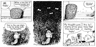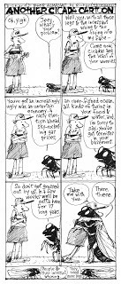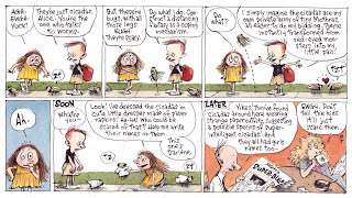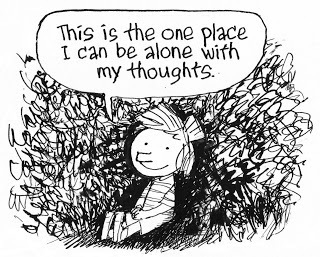 I've done a few Alice-in-the-shrub cartoons and each time I think they'll be easy to draw. Alice sitting amid a mass of leaves, what's difficult about that? But somehow each time I end up getting into the leaf-scribbling a little too intensely and I have to back off and use white to loosen things up and undensify the texture. Next time I'll either use a fatter nib or stand three feet away.