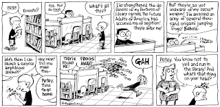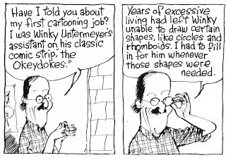 Ernesto has been barricading himself in a carrel fort in a remote corner of the library for several summers now though this is the first time he's felt compelled to explain why he'd need to. This Sunday strip is the remnant of a string of dailies featuring Ernesto's latest decline and fall. This time he was caught by the Future Adults of America appropriating a box of doughnuts meant for fund-raising and subsequently kicked out. I think he started a competing group but I forget what it was called.The origami jumping frog is a real thing, even if Ernesto possibly isn't. I like them so much I included one in the first published drawing of Alice (below), though they don't really look much like that. My wife can make them. She used to carry origami paper in her purse and would sometimes make things at an odd time, like when waiting for food in a restaurant. Then we'd all try to make the frogs jump into someone else's drink glass.