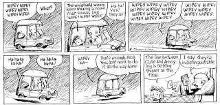 I've never heard windshield wipers say "Wipey". Those on my first car, an '82 Sunbird, went HIRNK-HORNK, but that sounds too much like an oboe onomatopoeia and I don't want to confuse people.The next week of Cul de Sac is all repeats I'm sorry to say.