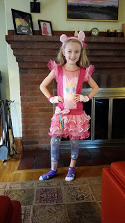 Amelia had a great night of trick or treating, dressed as Pinkie Pie from the "My Little Pony" TV show/toy franchise/world dominance mission. She and her friend Bridget, who was dressed as a cheerleader, merrily skipped around the neighborhood for about 75 minutes, filling their bags with all manner of chocolate, chewy fruit things and the odd bag of potato chips. Amelia even managed to collect a few coins for UNICEF.