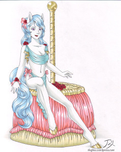 Originally drawn a couple years ago, inspired by this drawing, Heritage House “Yesterday” musical carousel horse, and classic My Little Pony art, dedicated to K. Healey of Letraset for his excellent customer service.