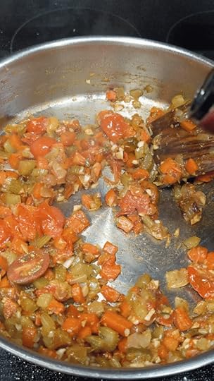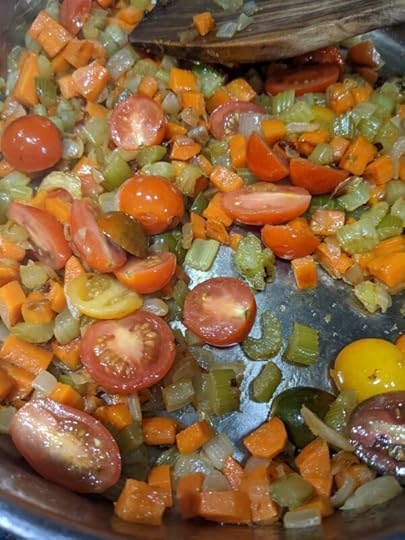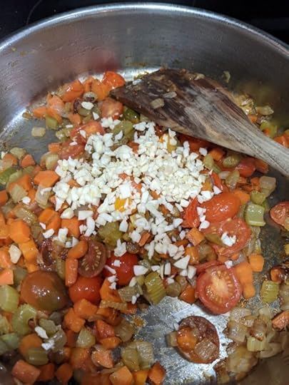 To do this, I use this time to halve my grape or cherry tomatoes, to slice my mushrooms, if I’m using any, to mince my 6 – 8 cloves of garlic, to open my bottle of wine, or to heat up my beef stock if I am not using wine. You can stir the mirepoix once in a while, but not often. I want you to resist the urge to hurry this step. Give it time, the flavors NEED to develop and you really can’t rush this. First, your onions will start to get soft, then they will get translucent, then they will turn golden, and finally, they will start to darken. THIS is the moment you are waiting for. Add your tomatoes.