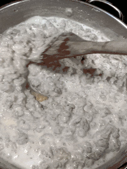 Over medium heat begin browning the sausage. As it browns use your spoon/ spatula to break the meat into small chunks. The size of the chunks will depend on your preference. In our house, we prefer smaller chunks and I prefer very small bits. I take my time and continuously break them down as they cook. Let the sausage cook completely and do NOT drain off the grease. Allow some browning to occur, this will increase the flavor. If you choose, you can add the additional tablespoon of butter or bacon grease at this step. I don’t ever seem to need it.Sprinkle the 1/4 cup of flour evenly and thinly over the fully cooked sausage. The more evenly you spread your flour, the lower your chance of creating lumps. Stir to coat all of the sausage with the flour and allow it to cook just a little longer, using your spoon / spatula to continuously scrape the bottom of the pan to prevent it from scorching. This step gets rid of the raw flour taste. Turn the heat to low.Slowly, approximately 1/4 – 1/2 cup at a time, add the milk to your meat and flour mixture. Stir between additions to incorporate the milk fully before your next addition. Scrape the bottom of the pan to prevent it from sticking and scorching.