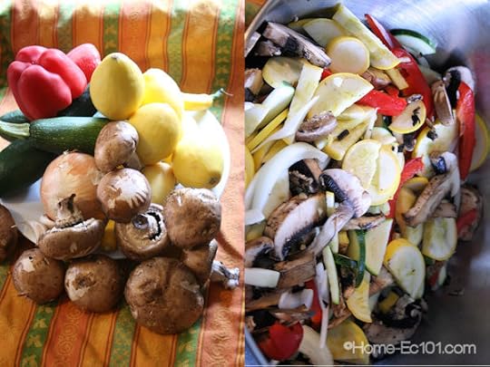 Gather your vegetables and slice or mince as appropriate. These vegetable packets will contain: bell peppers, zucchini, yellow squash, onion, garlic and mushrooms. *Note* Do not be lazy and assume your chef knife can go one more day without sharpening, even good cooks get distracted with less than fun results. Sharpen your knives regularly.