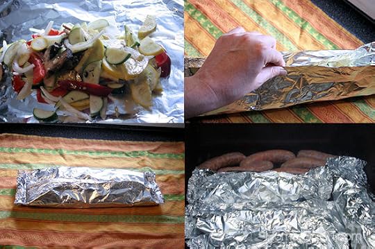 Grab a sheet of heavy duty foil, don’t get the wimpy stuff, you don’t need it tearing on the grill. Arrange a couple of healthy handfuls of vegetables in the center of the foil. Bring the long sides together and fold over in an accordion or pleat type fold. You want to keep the steam that will develop inside your packet. Fold the short side over a couple of times to close the packet tightly.
