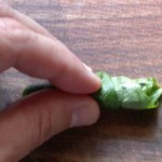 the leaves. Stack the leaves on your cutting board, and, starting from a pointy end rather than a side, carefully begin to roll up the stacked leaves. Neatness is not important here – just try to get them into a roll about the diameter of your pinky finger, more or less.