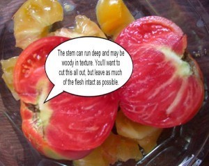 Wash the tomatoes and trim off any spots you find unappealing. Some tomatoes have a stem (or core) that go deeper into the tomato than you may find in other varieties. These parts can have a woody texture, so be sure to find and remove all of the stem/core or you may have an unpleasant surprise in your salad. (It won't hurt you – it'll just be rather hard to chew and taste more like tree than tomato.) Cut the tomatoes into largish chunks, right into the serving dish.