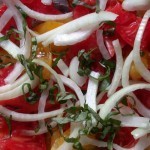 Simple Tomato Salad Recipe and Basil Chiffonade Tutorial4 large fresh basil leaves2 large, very ripe, homegrown tomatoes, about the size of your fist. Use an heirloom variety, if possible1 medium Vidalia or other sweet onionBlack pepper to taste, freshly ground if you have itSea salt to taste3 tablespoons extra virgin olive oil1 tablespoon balsamic vinegar