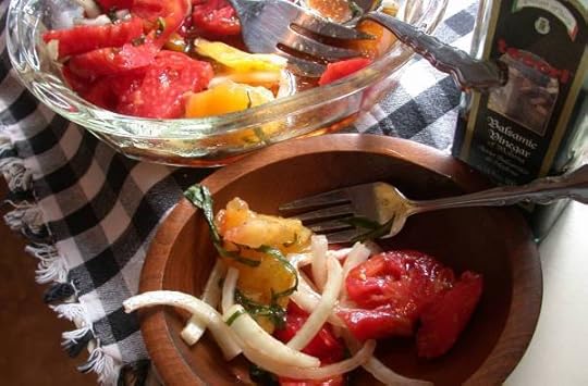 Balsamic vinegar (in my opinion) is perfect with tomatoes, but experiment with red or white wine vinegar, sherry vinegar, or lemon or lime juice. Use different onions, or use no onions. Or try shallots. Or….garlic! Vary the herbs. Use a combination. Or use none. Toss another veggie into the mix: a bit of colorful sweet pepper, either fresh or roasted & peeled. Cucumbers & tomatoes, chunked, then tossed with mayonnaise is a very quick and surprisingly good salad when you need something last minute.
