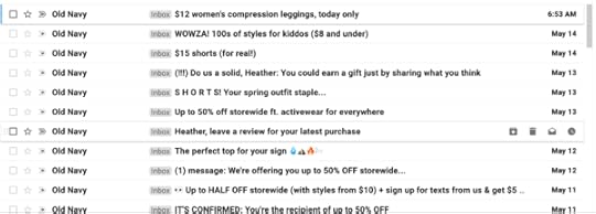 If your inbox is pretty out of control (ahem, Heather) you can often search and clear out a lot of emails at once. For example, in Gmail, if I search in:all from: old navy