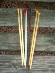 While you really need only one set of knitting needles to start, it's probably a good idea to have three sets of straight needles in sizes 7 (4.5 mm)** 8 (5 mm) and 9 (5.5 mm) handy to make adjustments. There's no need to be fancy; almost any reasonable pair of needles will do–although I do love my rosewood needles with amethyst and silver tips.