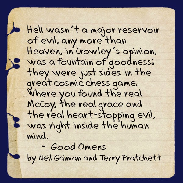 Good Omens is the literary equivalent of comfort food to me--the really good comfort food like your grandma makes that no one else can come close to replicating and when you want it, you want IT, and nothing else will do. That's Good Omens. I don't have to be in a certain mood or mind-frame to read it. I know at anytime I can pull it from the shelf, choose a page at random, and contentedly spend the remainder of the evening laughing to myself and being generally thankful writers like Neil Gai...
